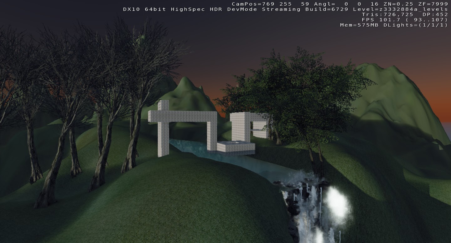 This was the beginning of a long process in attempting to create a waterfall. Also, the reason why there appears to be a thin sheet of something in the first Crysis image is because I could not manage to export my entire model from SketchUp. If anyone can help me that would be great!